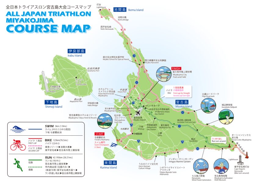 スイムは与那覇前浜を起点に、バイクは島内を縦横に駆け抜け、ランは市街地を巡る全168kmのコースです。