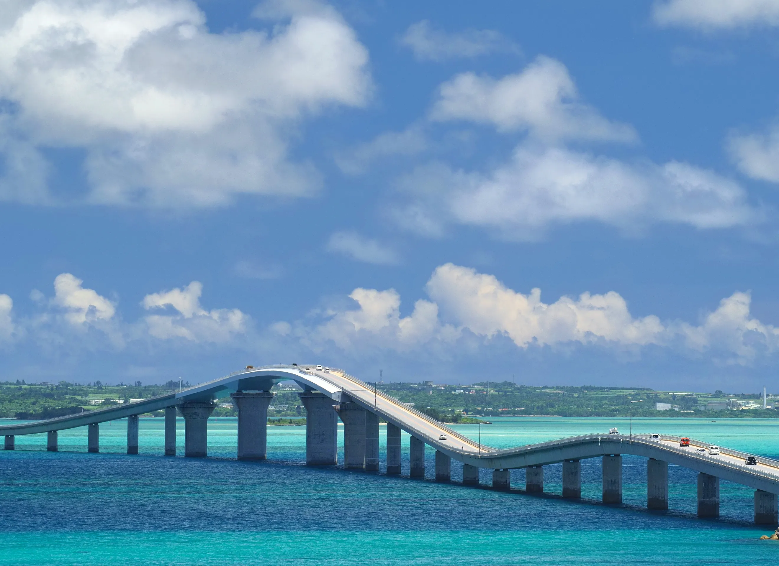 宮古島と周辺の島々をつなぐ「伊良部大橋」「来間大橋」「池間大橋」は、合わせて三大大橋と呼ばれています。どこまでも続く青い海を眺めながら走るドライブは爽快で、宮古島観光では外せない絶景スポットです。
