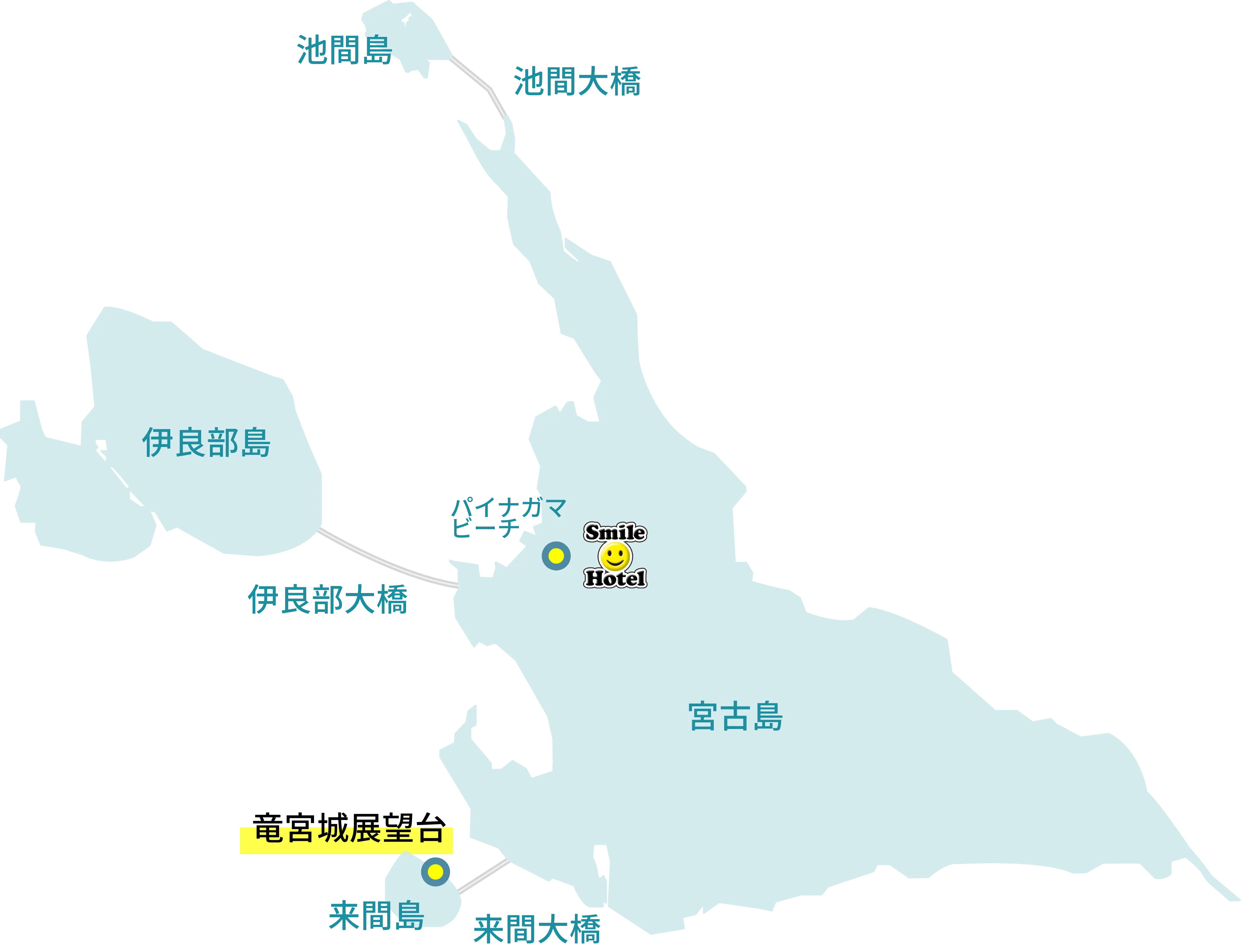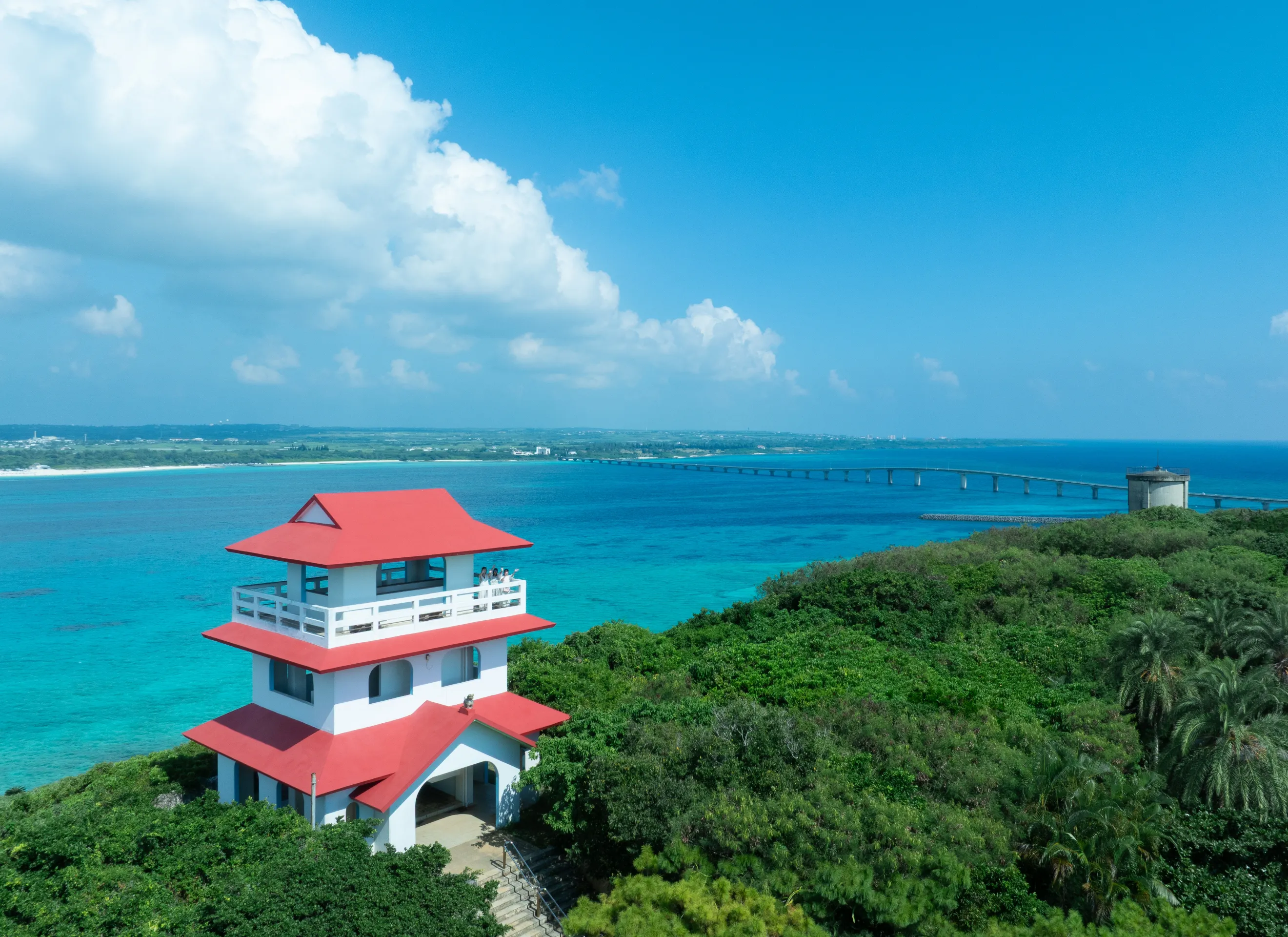 「竜宮城展望台」は、竜宮城のような赤い屋根が目印の3階建て展望台。「東洋一」と称される与那覇前浜ビーチや来間大橋を一望できる絶好のロケーションです。 昼の青い海はもちろん、夜の星空観察にもおすすめの人気スポットです。