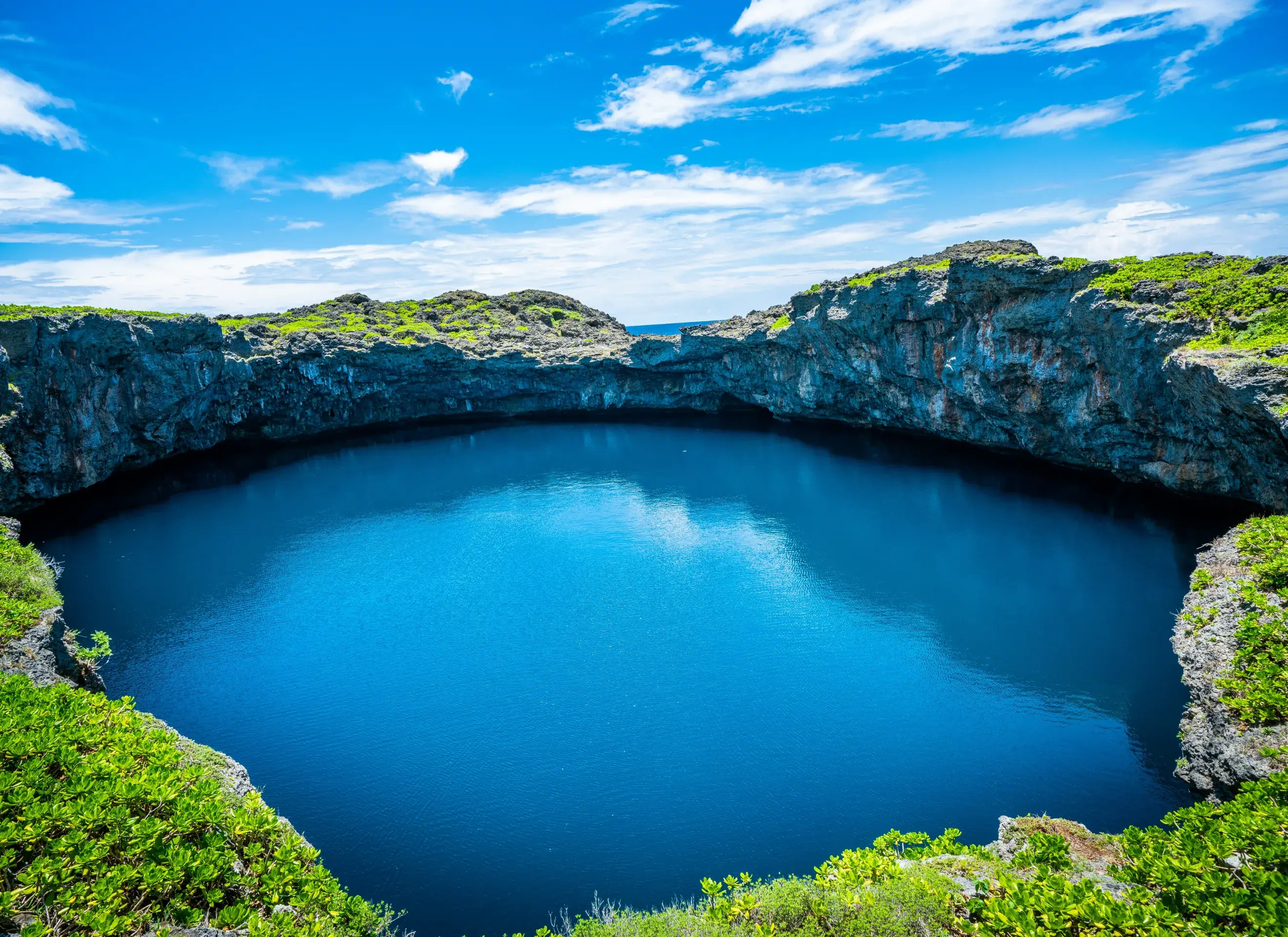 下地島の通り池は、沖縄県宮古島市(下地島)にある、国指定天然記念物「通り池」です。 大きさの異なる2つの池が並んでいますが、実は地下でつながっており、さらに海底洞窟を通じて外海とも通じているのが特徴です。その独特な造形から「和製ブルーホール」としてダイバーに人気で、神秘的な伝説が残るパワースポットとしても知られています。